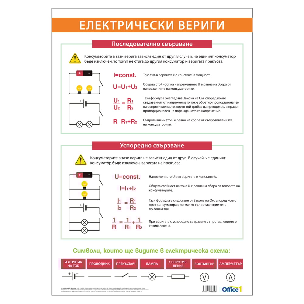 Office 1 Ученическо табло ''Електрически вериги'', 70 x 100 cm