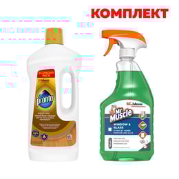 Препарат за почистване на под Pronto и дървени настилки Wood, 1 L, в комплект с Mr.Muscle Препарат за стъкла и прозорци, 750 ml, 1.75 l