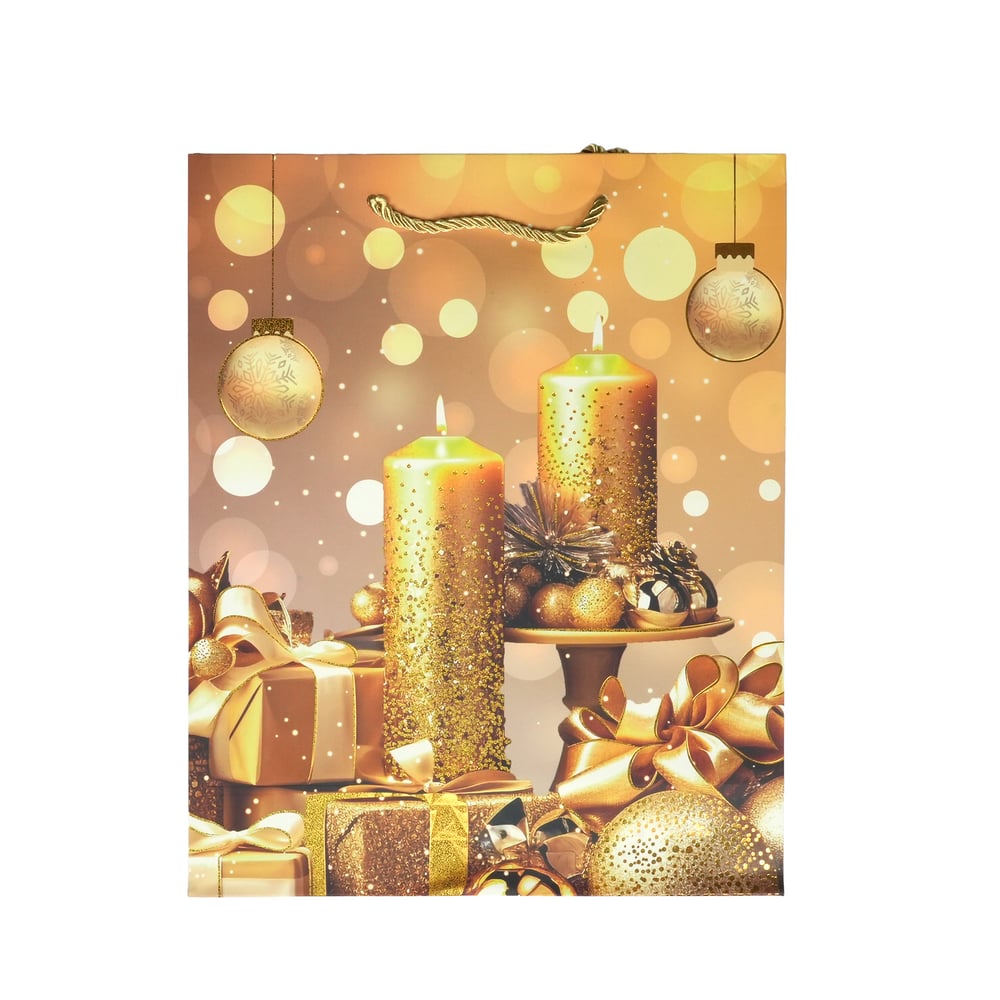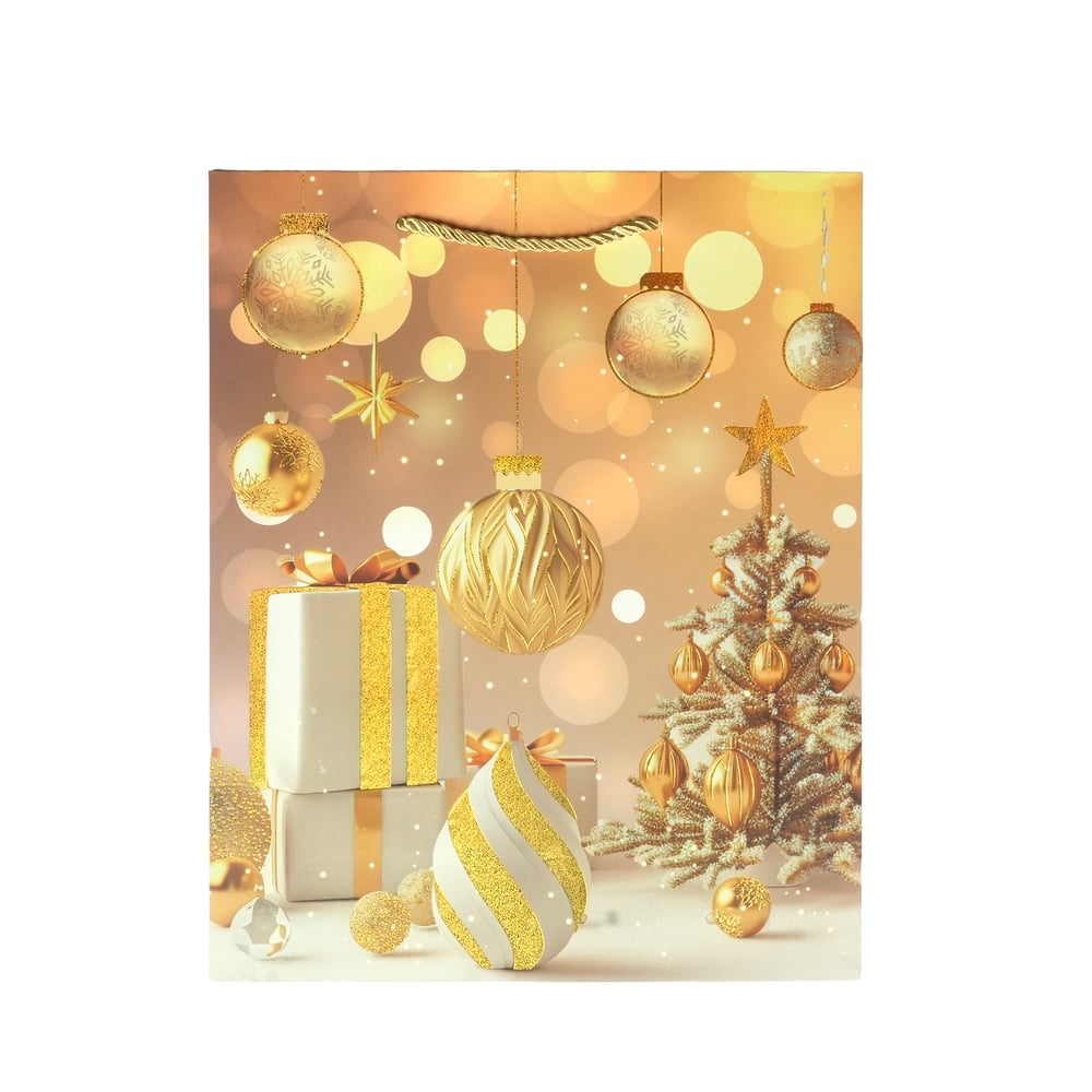 Подаръчна торбичка Топки и подаръци, коледна, 26 х 32 х 10 cm, златиста