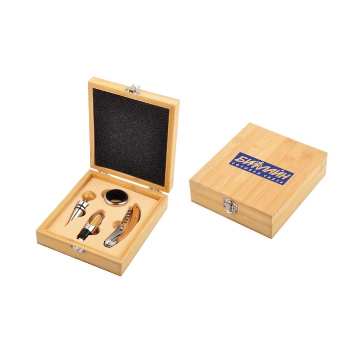 • Комплект аксесоари за вино, подредени в елегантна дървена кутия.