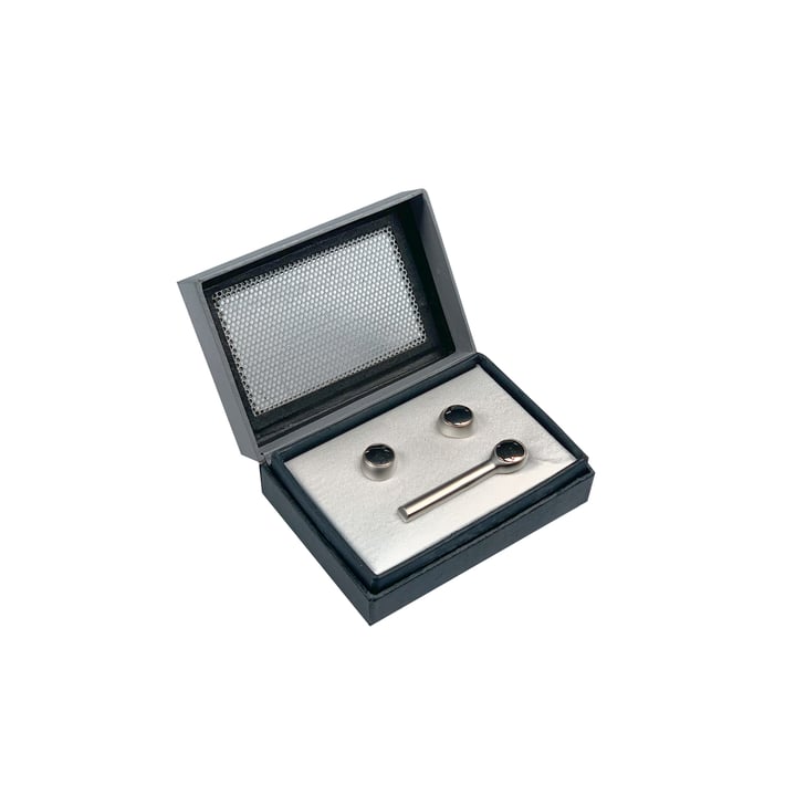 Подаръчен комплект от елегантна игла за вратовръзка и ръкавели.Размери: 60 х 40 mm.