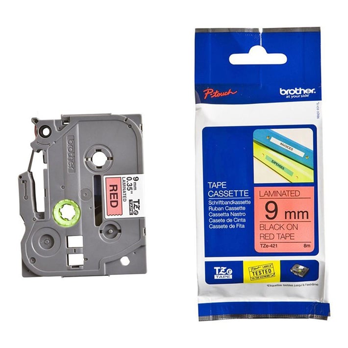 Brother TZE421 е лента с червен фон и черен печат, с ширина 9 mm, подходяща за създаване на ярки етикети.