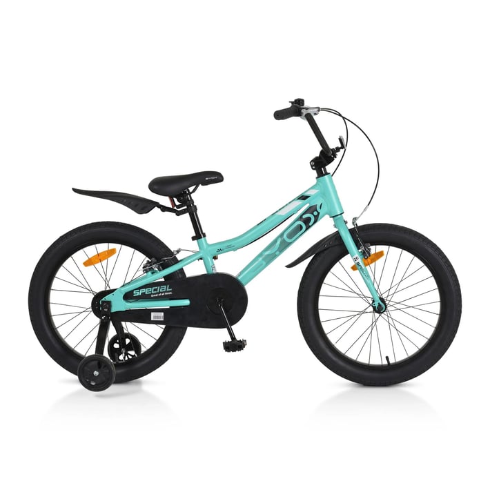 Детският велосипед е оборудван с помощни колела, звънец и луксозни калници. Подходящ за разходка в градски паркове и пътища с настилка, за деца на възраст от 6 до 10 години, с височина от 115 до 135 cm.