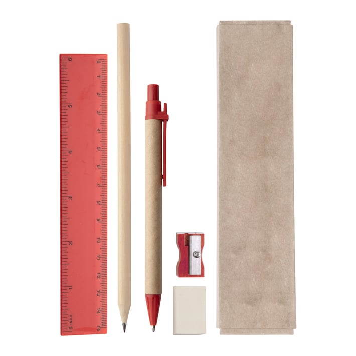 • Включва: химикалка от рециклирана хартия (със син пълнител), молив, линийка, острилка и гумичка.