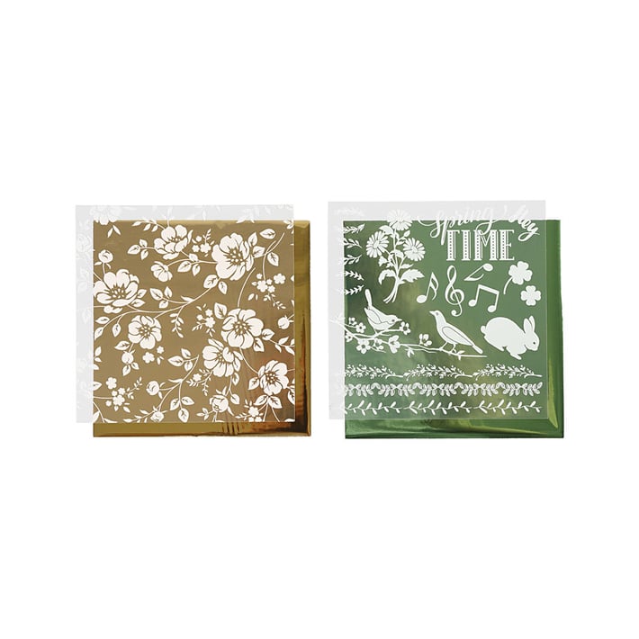Опаковка с 2 различни цвята (зелен и златен) деко фолио и 2 прехвърлящи листа.