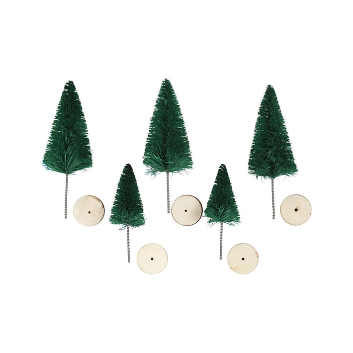 Малки елхички за декорация, изработени от найлонови влакна и усукана тел. Всяка елха разполага с малка дървена стойка на която да се монтира.