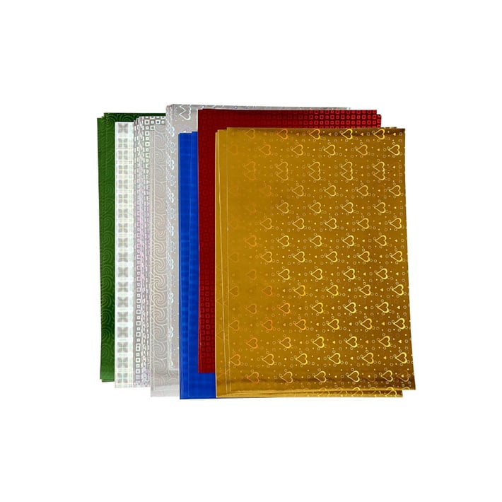 • Асортимент от едностранна метална хартия с гланцово покритие и холографски модели.