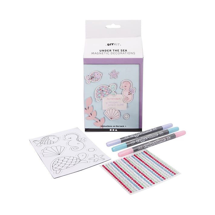 • Комплектът съдържа всички необходими материали за декорирането и създаването на магнитчета с мотив "морско дъно". Комплектът ще стимулира въображението и креативността на вашето дете.