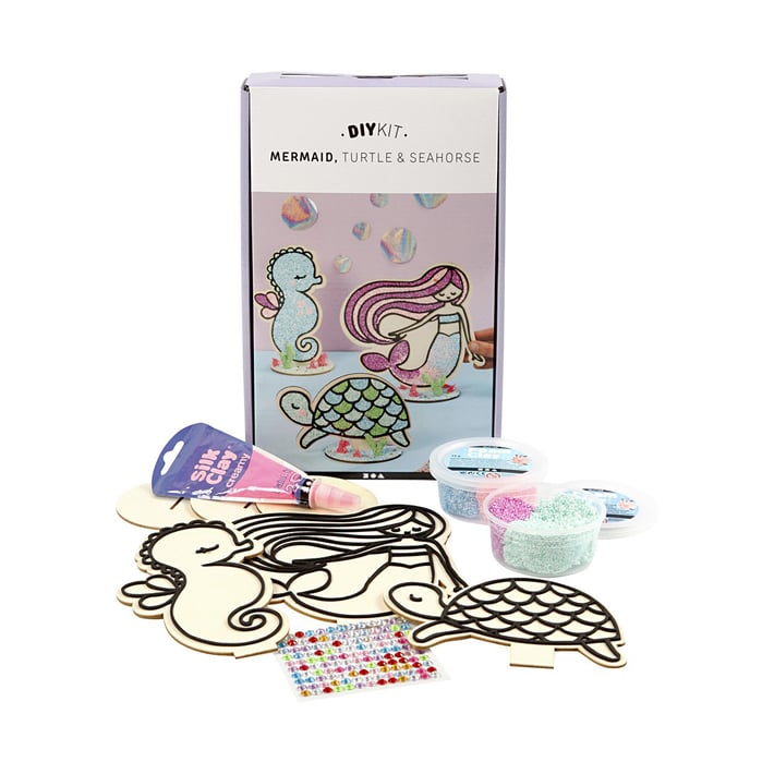 Съдържание: 3 различни декоративни фигури от дърво - русалка, костенурка и морско конче с мотив в EVA пяна, пластилин пяна с брокат и залепващи се камъчета за декорация в различни цветове.