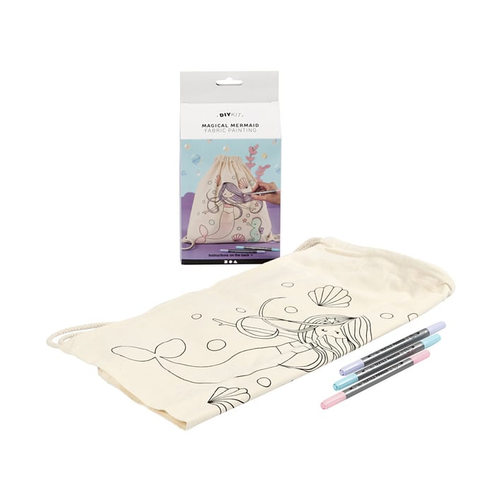 • Комплект материали с раница/чанта за гимнастика, направена от 100% памук с предварително отпечатан мотив-русалка.