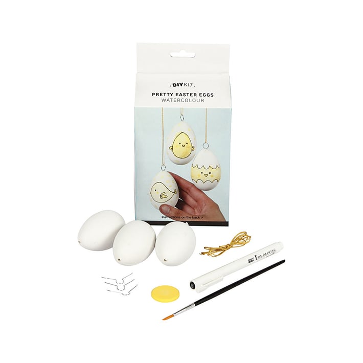 • Съдържание: 3 пластмасови яйца, 1 жълта акварелна боя, 1 четка, маркер, кукички и връв.