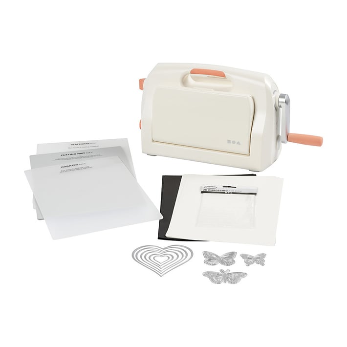 Съдържание: 1 машина за рязане и щамповане с работен плот, подходящ за голямо натоварване, 1 акрилен лист за изрязване, 1 режеща плоча, 2 шаблона, 2 шаблона за щамповане и 10 листа.