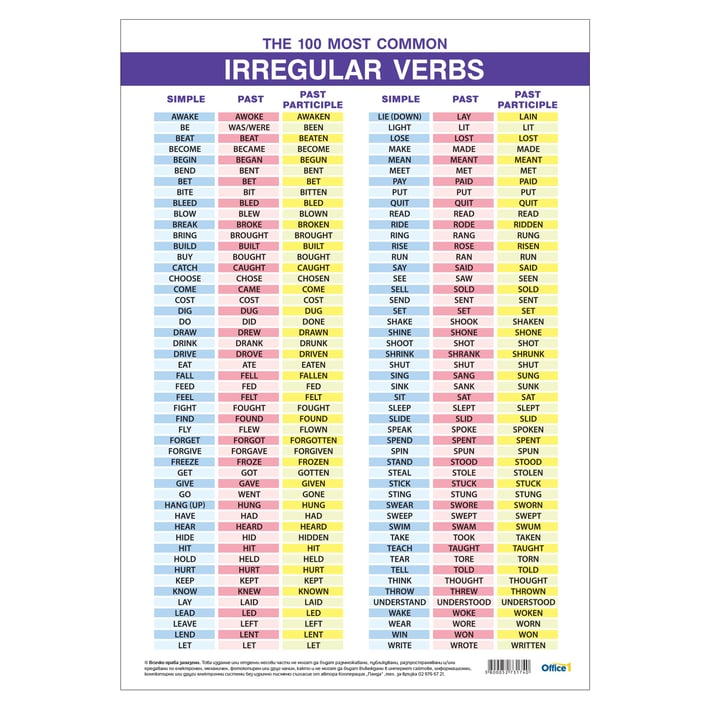 • Двустранно ученическо табло ''100 неправилни глагола в английския език''.