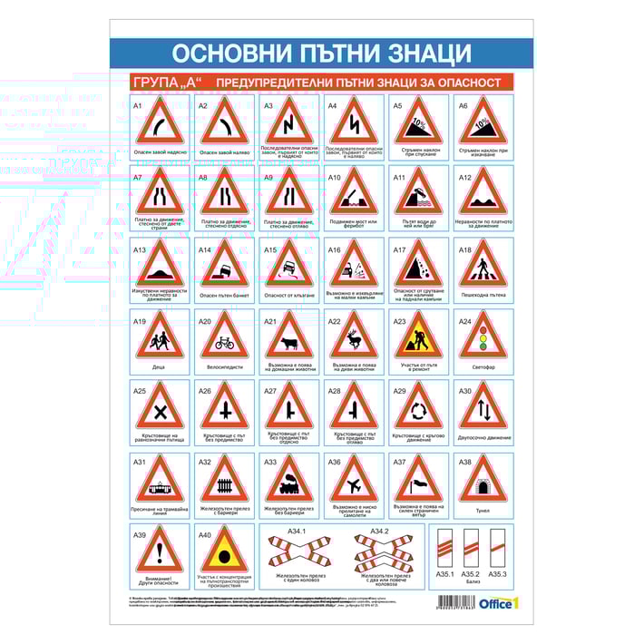 Office 1 Ученическо табло ''Безопасност на движението - основни пътни знаци'', без лайстни, двустранно