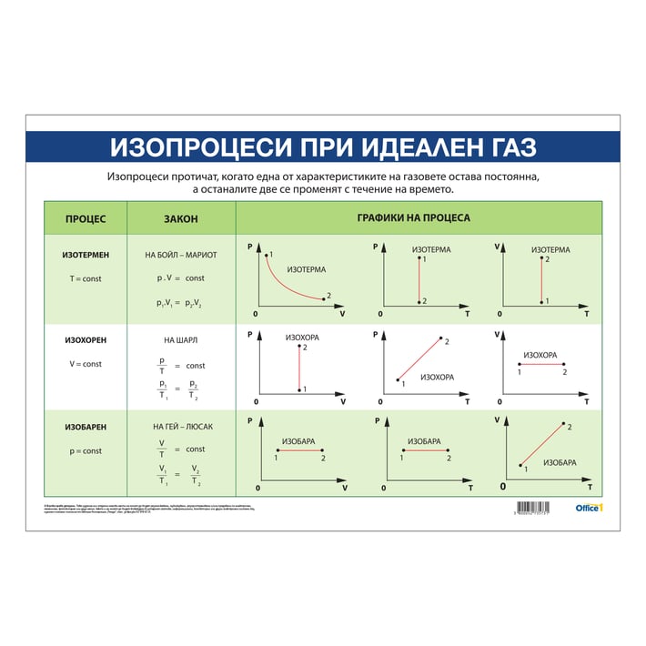 В учебното табло „Изопроцеси при идеален газ“ са представени изотермен процес, изохорен процес и изобарен процес. Дадени са формулите, описващи законите на Бойл-Мариот, на Шарл и на Гей-Люсак. Първия принцип на Термодинамиката е записан и за трите изопроцеса при идеален газ.