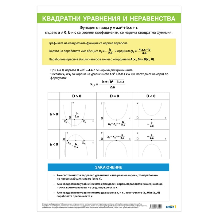 • Двустранно учебно табло ''Квадратни уравнения''. Подходящо е за часовете по математика.