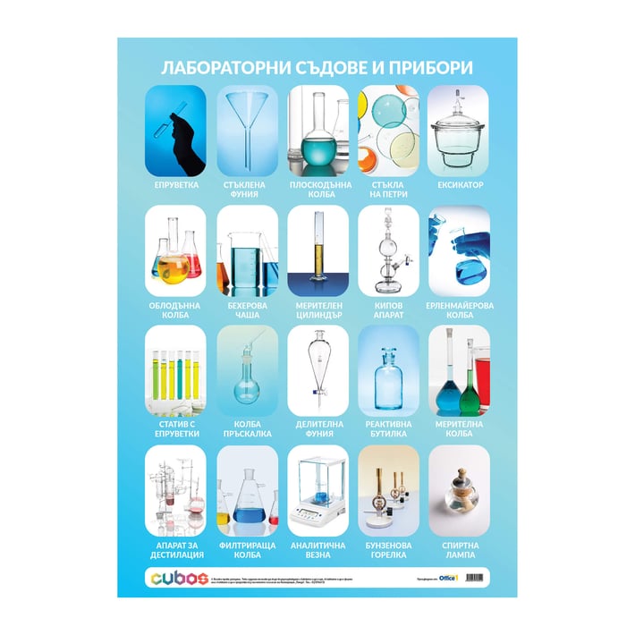 • Таблото представя основните съдове и прибори, които се използват в химическата лаборатория.