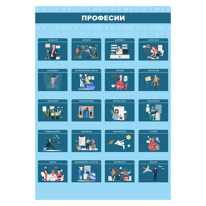 • Двустранно ламинирано учебно табло. В него са изобразени някои от най-разпространените професии.