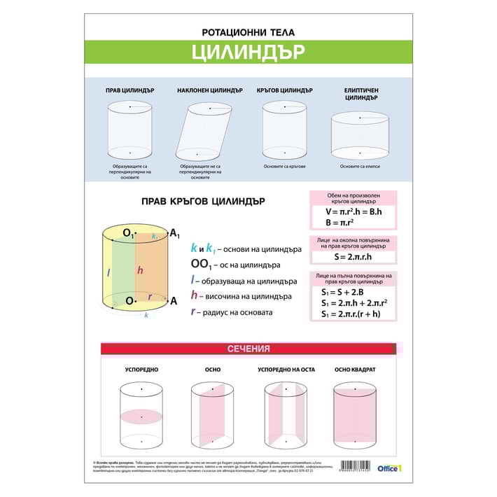 • Двустранно ученическо табло ''Цилиндър''. Съдържа информация за изобразените фигури, техните формули и сечения.