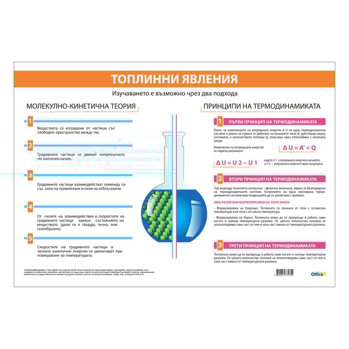 Таблото разглежда двата подхода за изучаване на Топлинните явления. Статистическият подход се нарича Молекулно-кинетична теория. Представени са нейните пет основни положения.