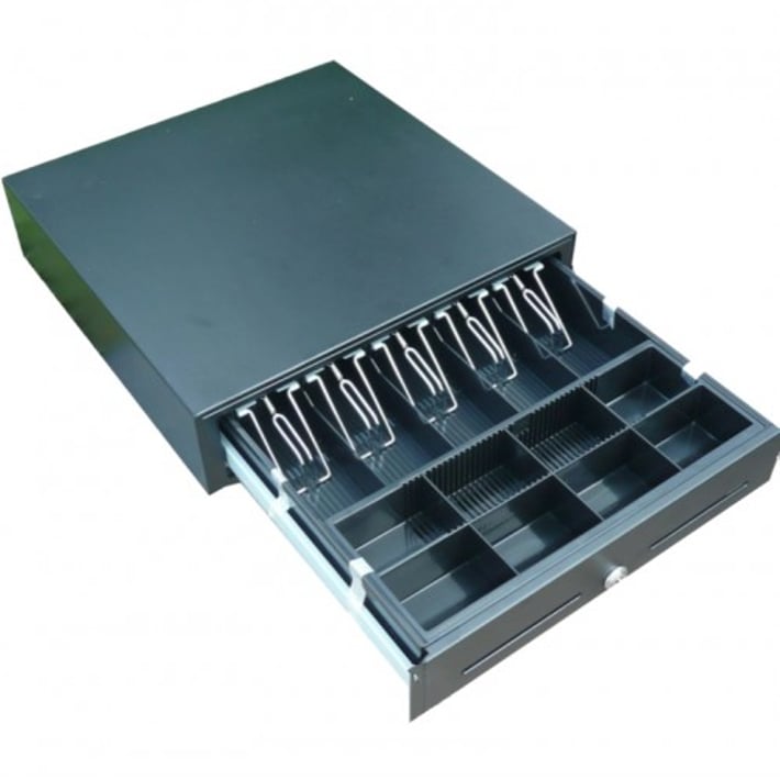 Черен метален сейф за каса Daisy. Притежава 5 отделения за банкноти и 8 отделения за монети.