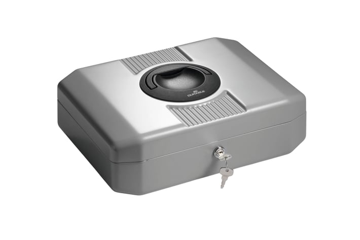 Durable Uroboxx е издръжлива, сигурна и лесна за употреба каса, комбинираща подредена монетна тава и удобни отделения за банкноти. Предлага отлична защита и лесно управление – отличен избор за професионална употреба..С подвижна тава за сортиране на монети за всички купюри от центове и евро, включително 2 комбинирани отделения за монети от 1 и 2 евро и 1 и 2 цента, отделение за банкноти за временно съхранение и тава с 4 отделения за банкноти.С прибираща се, ергономично оформена дръжка.Абсолютна безопасност чрез плътно затварящ се капак, скрити панти и двойна ключалка с резе. Цилиндрична ключарка с 2 ключа и индивидуален номер - за безопасна и лесна смяна при нужда.Капацитет за монети: 233.90 евро.