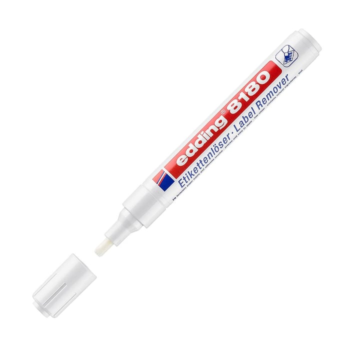 Премахване на лепкави етикети е едно от онези незначителни, но все пак доста досадни предизвикателства, с които всички се сблъскваме в ежедневието. Помощта идва с практичния маркер за премахване на етикети на Edding, който позволява прецизно контролиране на дозите. Позволява премахването на хартиените етикети и техните остатъци без усилие от стъкло и порцелан. Също така премахва остатъците от лепило на стикерите на предното стъкло, а етикетите на обувките изчезват за броени минути. Маслото със слаб мирис се основава на естествени, възобновяеми суровини, което прави маркера добър не само за премахване на етикети, но и за околната среда.Маркерът за премахване на етикети може да се използва и върху вертикални повърхности, без да капе.Върхът на маркера е с широчина от 4 mm.