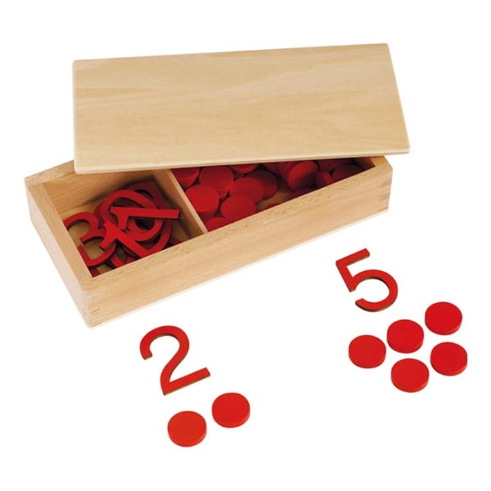 С този класически Монтесори комплект с дървени цифри и жетони децата по забавен и практически начин усвояват основите на математиката. Чрез съчетаване на цифри и чипове, те откриват връзката между символа и количеството, както и разликата между четни и нечетни числа.