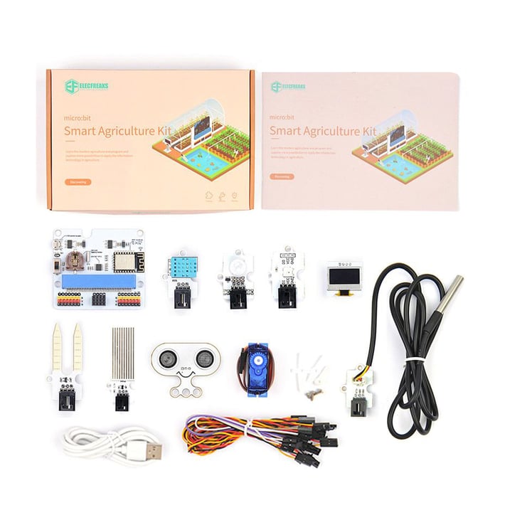 Комплектът за интелигентно земеделие micrоbit има богат избор от IoTbit, температурен сензор DS18B20, сензор за влага в почвата, сензор за ниво на водата, PIR сензор, серво и т.н., бихте могли да го използвате за създаване на проекти като машина за отблъскване на насекоми, екологична оранжерия, устройство за следене на нивото на водата в езерото за риба и други, от които можете да опознаете модерното земеделие и да програмирате и изследвате повече възможности за прилагане на информационните технологии в земеделието.