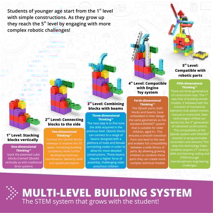 Комплектът се предлага в удобна пластмасова кутия за съхранение, която съдържа голям брой пластмасови части Engino - Qboidz и роботизирани устройства, като контролер ERP Mini, двигател за постоянен ток, светодиод и сензор за докосване, позволяващи конструирането на 8 роботизирани STEM модела.