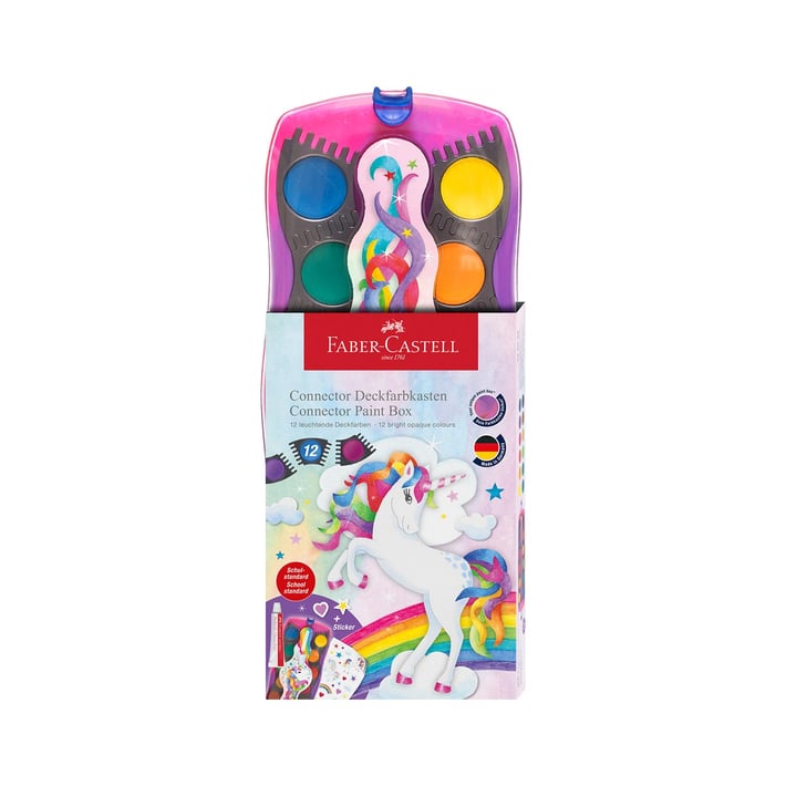 Faber-Castell Акварелни бои Connector – Еднорог са специално създадени за малките художници, които искат да комбинират забавление с творчество. Със своите 12 ярки цвята и уникален дизайн, този комплект е идеален за стимулиране на въображението и развитието на художествените умения.