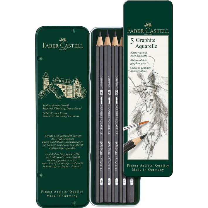 Водоразтворимият молив GRAPHITE AQUARELLE е идеален за предварителни скици, акварелни рисунки и за цялостни техники с графит. Той се отличава с допълнителна устойчивост при счупване - 3.3 mm дебелина на графита и се предлага в пет степени на твърдост HB, 2B, 4B, 6B и 8B.