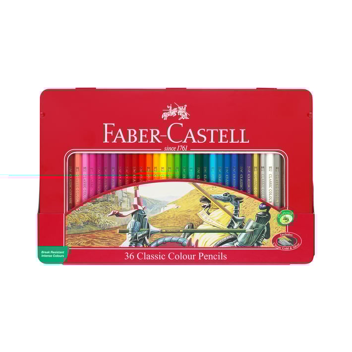 Цветните моливи от серия „Замък“ са с класически дизайн и изцяло въплъщават духа на Faber-Castell. Те са със стандартен размер и шестоъгълна форма. Отличават се с ярки и наситени цветове. Налични са в различни комплекти до 60 цвята.Шестоъгълни висококачествени моливи в метална кутия.Нечупливост на графита, защитен чрез SV система на свързване на графита с дървесината.Гарантирано подостряне без счупване.С място за надписване на кутията.