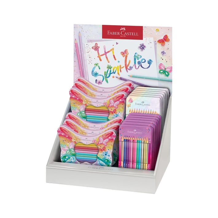 Открийте магията на Faber-Castell Sparkle с този уникален дисплей, който събира на едно място всички бляскави и красиви продукти от серията. Идеален за продажба в магазини и за привличане на вниманието на творчески натури!
