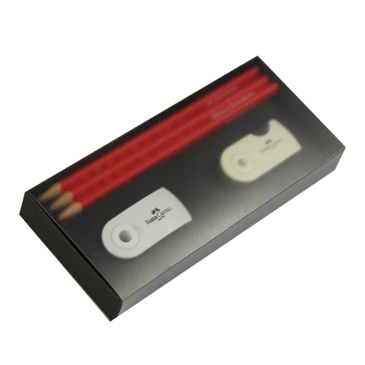 Този елегантен комплект в бял цвят се състои от 3 чернографитни молива с триъгълна форма, гума с мини ръкав и единична острилка.