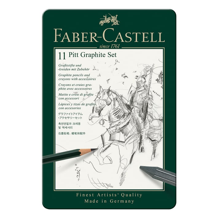 Гамата Pitt Graphite на Faber-Castell предоставя на всички творци широка гама моливи и пастели с различни степени на твърдост за скициране, графичен дизайн и работа със светлосенки. Емблематичният зелен молив на Faber-Castell, получил признанието и одобрението на Ван Гог и Гьоте, вече е част от ежедневието ни. 16-те различни степени на твърдост варират от деликатен сив оттенък до наситено черен графит и предлагат на художниците широк спектър от възможности. Чистият лакиран графит e идеалeн за създаване на контрасти и щриховане на големи зони. Този графит дава възможност за създаване на различни ефекти, в зависимост от натиска и степента на твърдост. Графитите с шестоъгълен пастел са идеални и за големи скици.