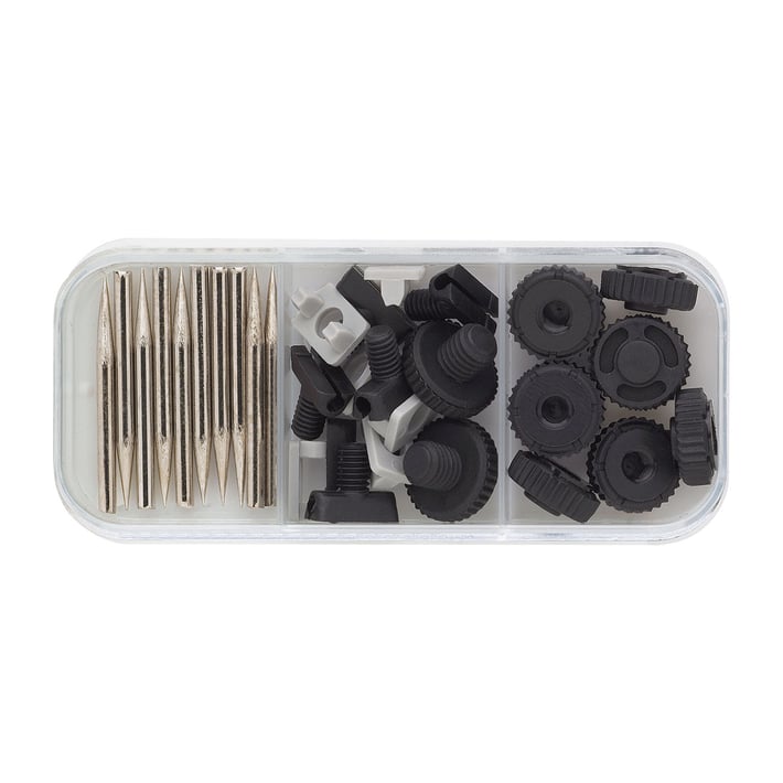 Практичен комплект резервни части за пергели от Faber-Castell, предназначен да поддържа вашия инструмент винаги в отлична работна форма. Кутията съдържа разнообразие от сменяеми елементи и аксесоари, които осигуряват продължителна употреба на пергела и позволяват лесни ремонти или подмяна на износени части.Комплектът включва различни накрайници, върхове и винтове, подходящи за употреба с широка гама пергели на Faber-Castell, което го прави идеално допълнение към училищни, студентски или професионални комплекти за чертане. Компактната кутия осигурява удобство при съхранение и пренасяне, а ясното разпределение на частите улеснява бързия достъп и подмяната.