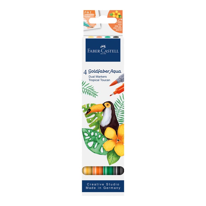 Маркерите Goldfaber Aqua Dual от Faber-Castell са идеалният избор за всички, които искат да се потопят в релаксиращия свят на акварелното рисуване. Комплектът включва вдъхновяващи тропически цветове, които придават свежест, жизненост и артистичен дух на всяка творба.