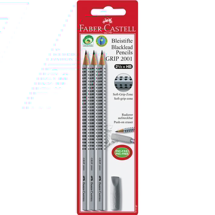 Комплектът включва 3 броя черногафитни моливи Faber-Castell Grip 2001 и острилка. Притежават ергономична триъгълна форма.Имат патентовата мека зона за захващане и свободно движение на ръката.Имат сребрито покритие - еко боя на водна осова.Нечупливостта на графита е защитена чрез SV системата за свързване към дървесината.Твърдост на графита: HB.