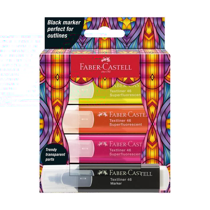 Комплектът включва 4 цвята – три ярки неонови (жълт, оранжев, розов) и черен маркер за акцентиране, текстуриране или контур.