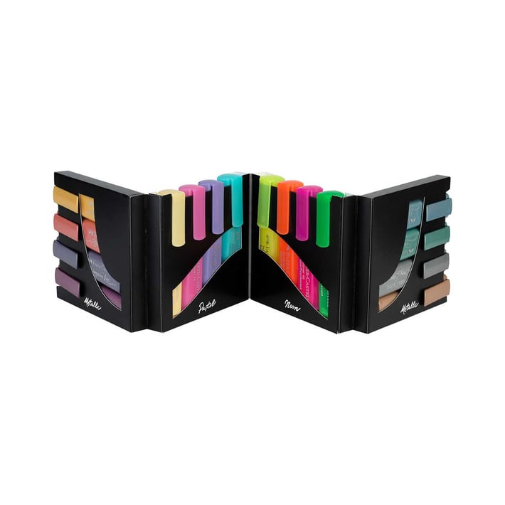 Комплект за бюро от 16 текст маркера с включени 4 неонови, 4 пастелни и 8 металикови цветове.Мастило на водна основа.С три различни широчини на линията: 1, 2 и 5 mm.Идеални за всички типове хартия. Равномерно нанасяне на цвета. Съхранявайте в хоризонтално положение.