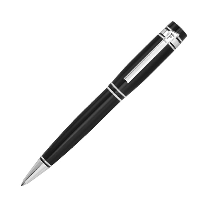 Леко уголеменият силует на автоматичната химикалка е завършен с лъскав лак и подсилен с хромирани акценти и детайлни гравюри.