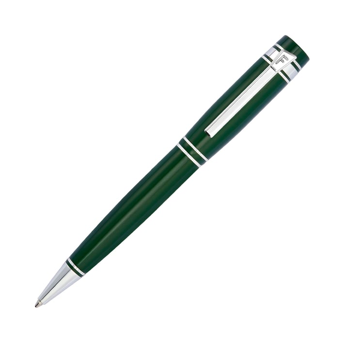 Леко уголеменият силует на автоматичната химикалка е завършен с лъскав лак и подсилен с хромирани акценти и детайлни гравюри.