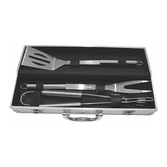 Комплект от висококачествени аксесоари за барбекю, включващ щипки, шпатула и вилица.