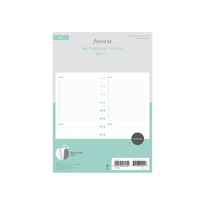 • Пълнител за тефтер Filofax, в размер A5, с 56 бели линирани листа за задачи.