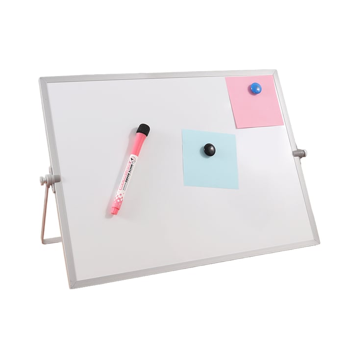 Практична и универсална магнитна бяла дъска с алуминиева рамка, идеална за дома, детската стая, училище или офис. Благодарение на гладката си повърхност и магнитните свойства, тази дъска е чудесна за писане с маркер за сухо триене, както и за прикрепяне на бележки, снимки, организационни табла или важни съобщения с помощта на магнитчета.Рамката от алуминий прави дъската лека, но здрава, което улеснява ежедневната употреба и гарантира дълготрайна устойчивост. Повърхността на дъската се почиства бързо и лесно – без петна или остатъци след маркери за сухо триене.Благодарение на стабилната си поставка, дъската е предназначена за настолна употреба, което я прави изключително удобна за бюро, ученически чин или работен плот – без необходимост от монтаж.