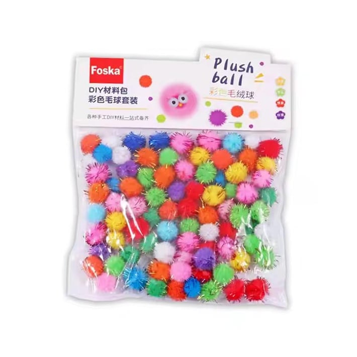 Забавен и креативен комплект от 100 цветни пухкави топчета с блестящи нишки, подходящи за декорация и арт занимания. Те са леки, меки и лесни за употреба - идеални за училищни проекти, DIY изработки, украси и различни крафт активности.