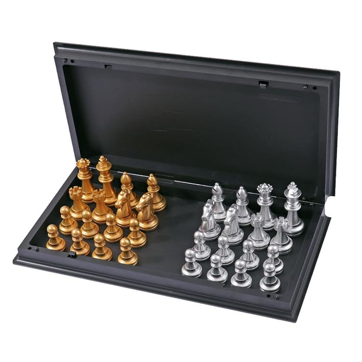 Комплектът включва сгъваема шахматна дъска и магнитни фигури в елегантни златисти и сребристи цветове. Магнитната основа на фигурите осигурява стабилност по време на игра, което го прави подходящ както за начинаещи, така и за напреднали.