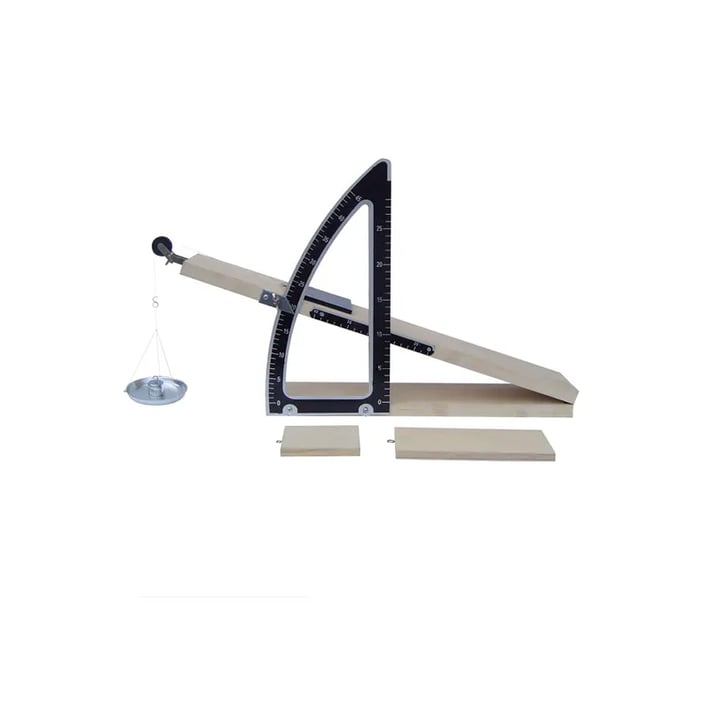 Тази дървена наклонена равнина с регулируем ъгъл на наклона има метален скрипец в горния край, който държи метален съд за тежести. Тежестите упражняват сила върху тялото, поставено на равнината. Приложеният транспортир има две скали (в градуси и сантиметри) за измерване.