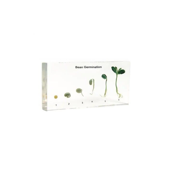 Жизнен цикъл на покълване на бобовите зърна в 6 етапа, с образец на растение.